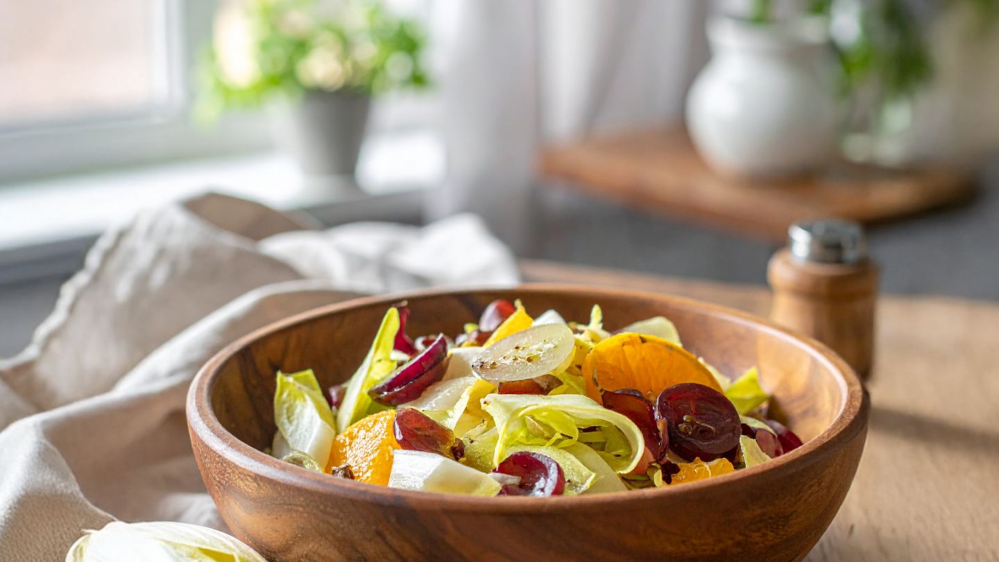 - Chicorée waschen, trockentupfen, in Ringe schneiden und hinzugeben.
